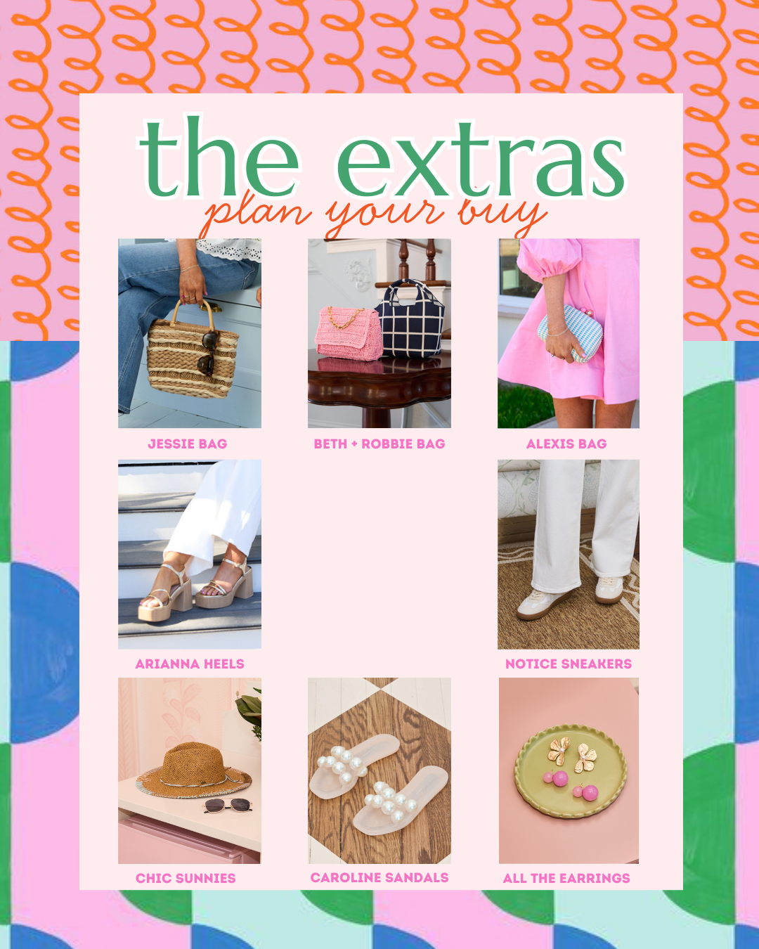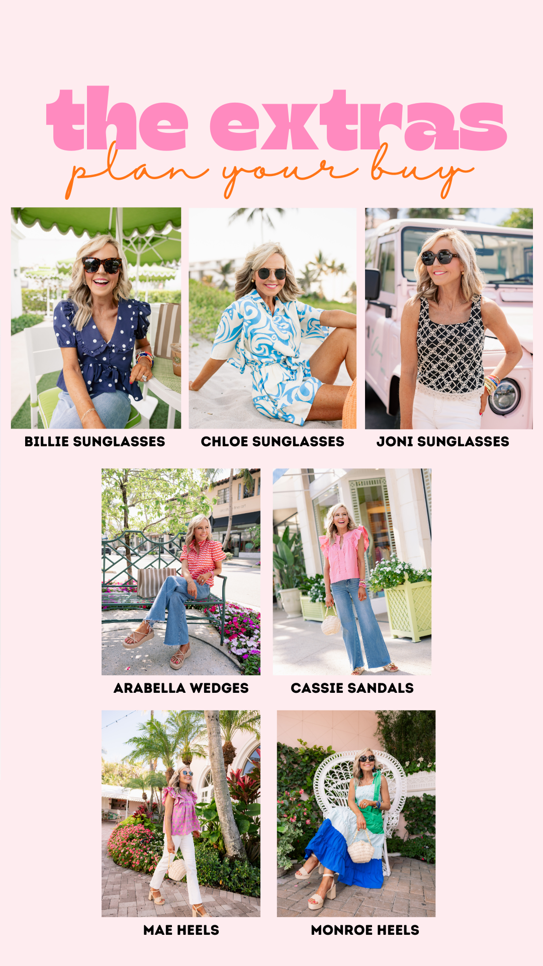 Ready to take note of all the extras??? The outfit finishers and fabulous accessories that pull together your entire look and make it stand out in the most special way… wonderfully woven bags + colorful earrings that pack a punch without breaking the bank and of course = the summer sunglasses you’ll never want to leave home without! These add-ons finish off a head-to-toe Shop Avara look and my top picks include the Corinna + Judith Bags, Eleanor + Skye Earrings, Chloe + Joni Sunglasses and the Arabella Wedges + Mae Heels.