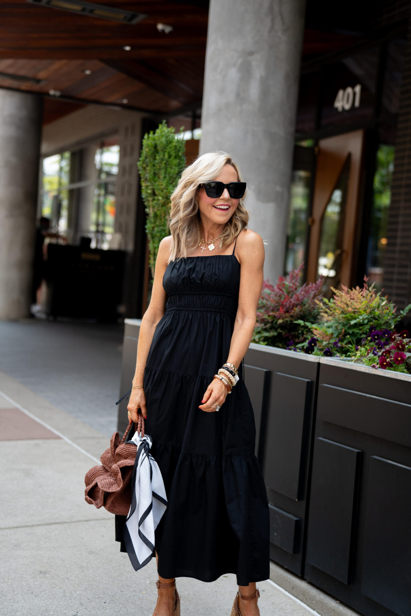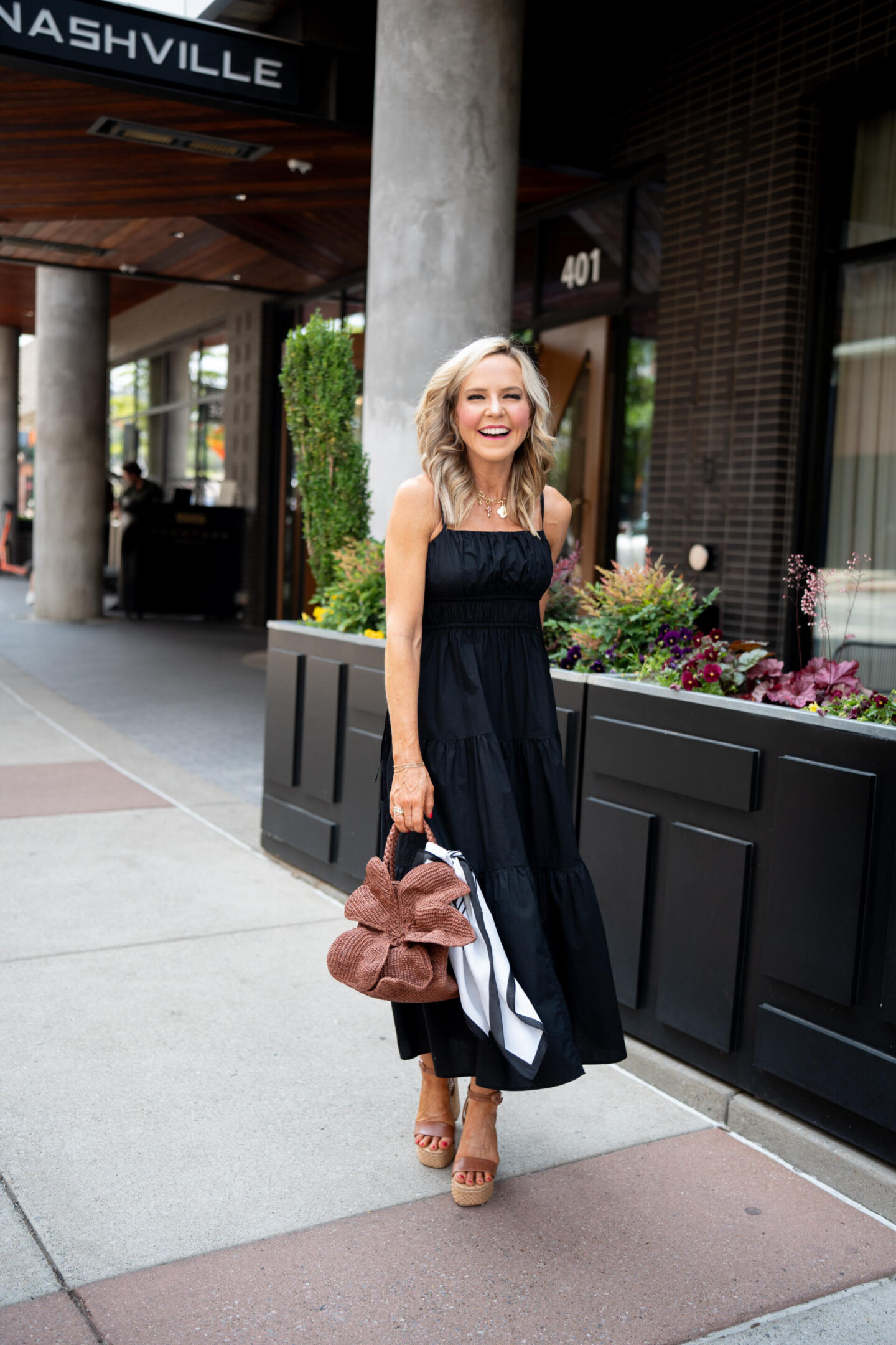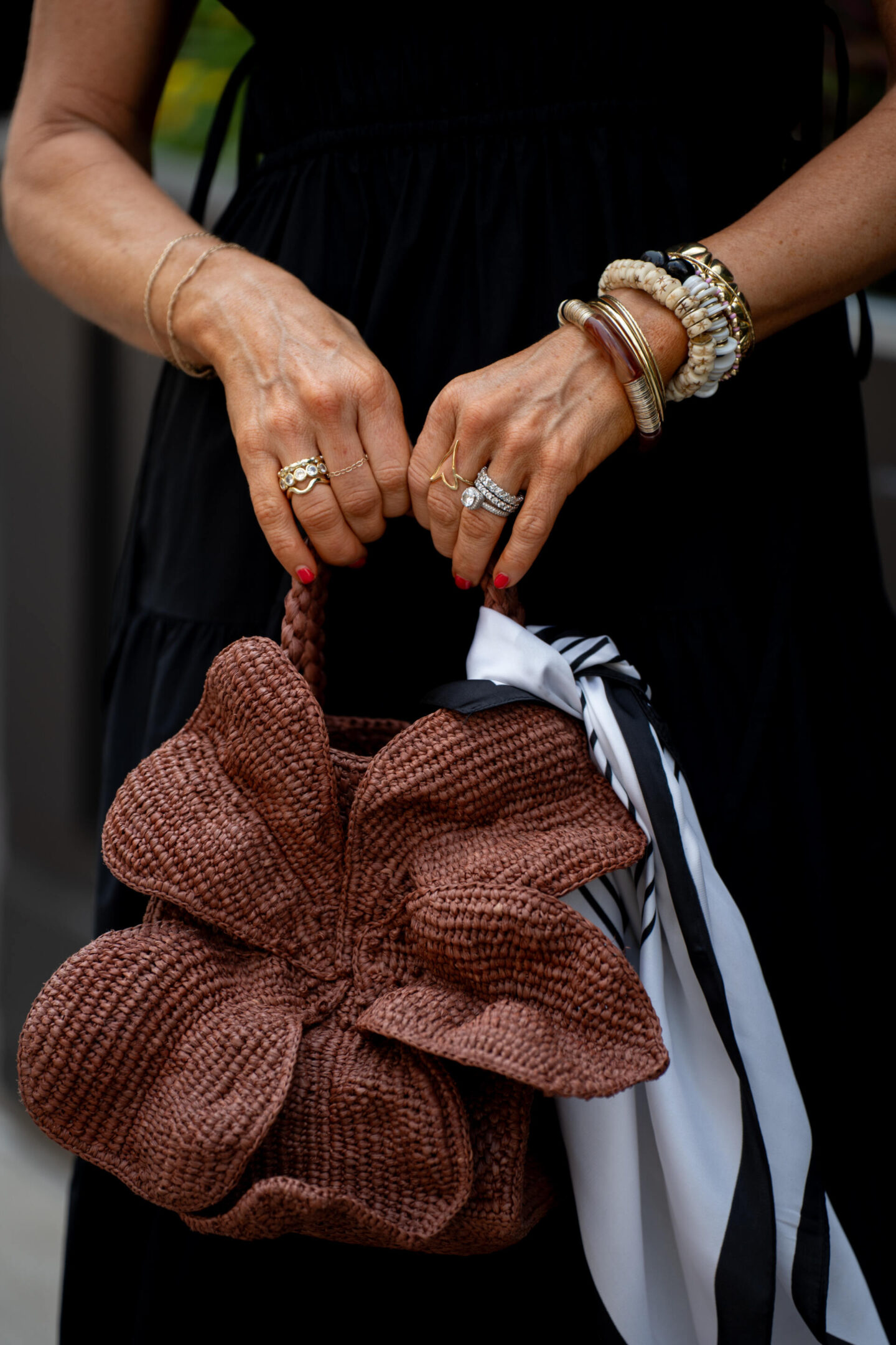 Now onto option #2… you’ve seen me styling these stacked raffia Dolly Heels from Larroude on the regular as of late and it’s because they are practical, perfectly neutral in that they go with anything and everything and they are SUPER comfy, too. I then incorporated this amazing Leila Floral Basket Bag from Sezane and twisted on this black and white Palm Print Scarf and called it complete! It just goes to show you can make neutrals pop in a big way when worn together and I love nothing more than mixing brown + black together.