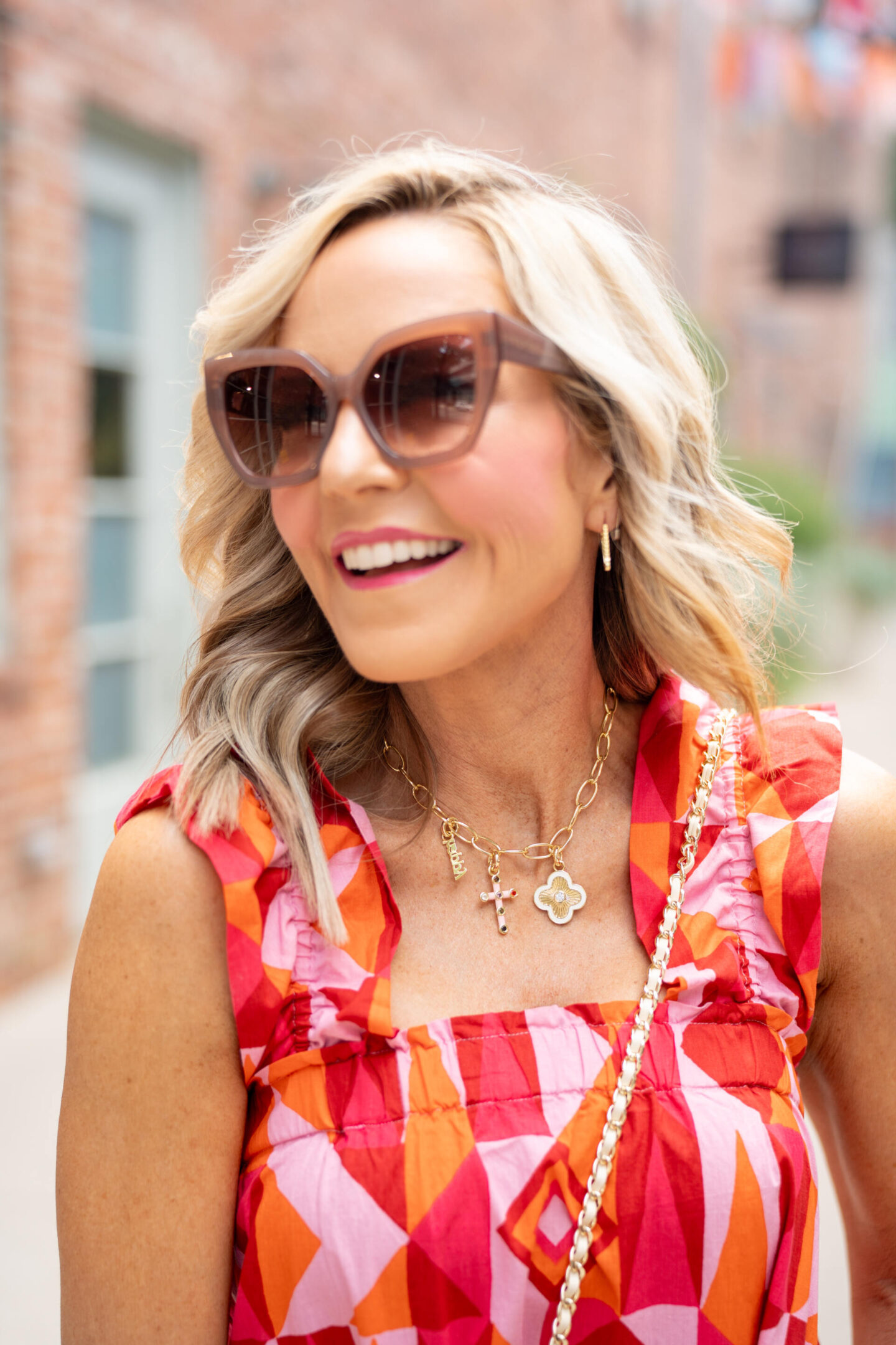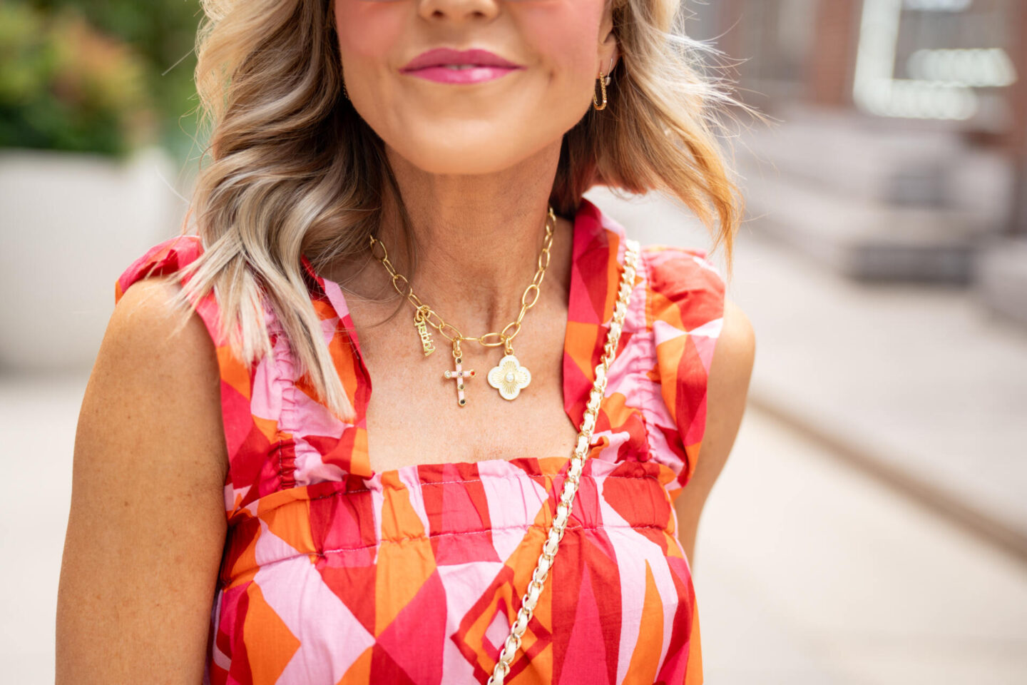 I will always have on some arm candy… that’s just who I am! A stacked wrist is my love language. I’ll layer up my favorite bracelets and then top things off with one of the new collection charms — the Pink Cross is a personal fave — hanging from a gold chain for a little pop of personality. And let’s not forget the Hammered Rectangle Earrings… they’re that easy, go-with-everything, casual-but-put-together kind of staple that are SUPER lightweight, too. I wear them on the daily with everything from denim shorts to flowy sundresses.