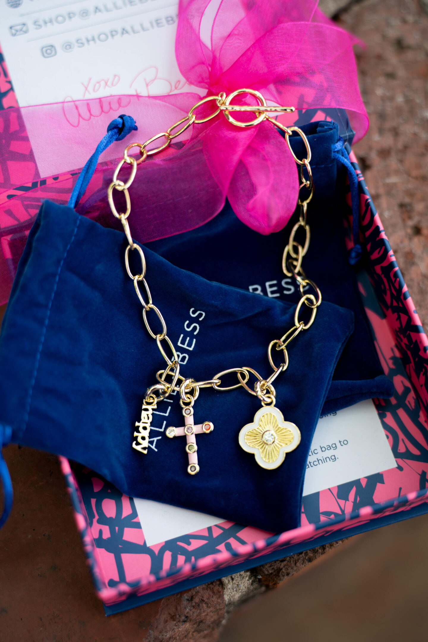YOU!!! Everyone went crazy for the Charmed in Cheer Necklace we debuted last holiday and we’ve been hard at work designing fabulously fun and NEW charms to add to my favorite necklace ever! When people stop me on the street to ask about my jewelry, it’s the ultimate compliment and this go-around was all about a beautiful cross charm that’ssuper colorful, a classes white enamel quartrefoil char, that wishes you good luck and harmony and of course the happy charm = it’s name speaks for itself so you can wear a little slice of happy each and everyday!