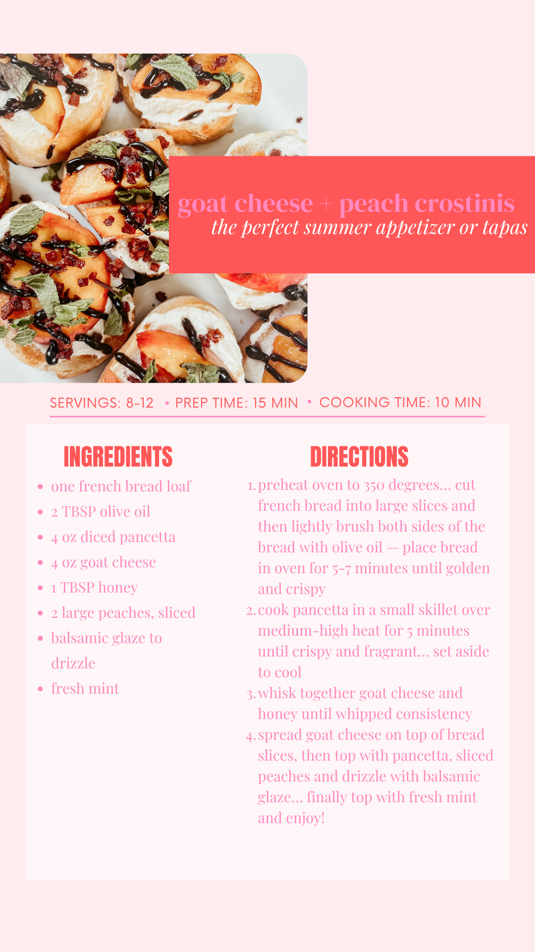 Fresh peaches, tangy goat cheese, a drizzle of honey and a sprinkle of basil make every bite feel like sunshine on a crostini. I originally shared this appetizer a few years ago and got so many messages asking for it again, so I figured it was time to bring it back to the blog—because recipes this simple + delicious deserve an encore.