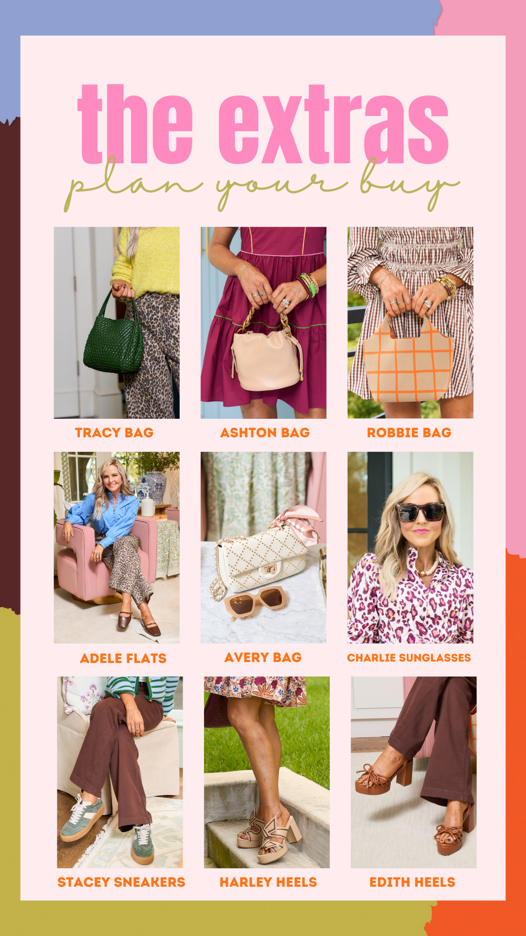 Now we can’t forget about the extras that top off every look!! You know I never walk out the door without a stellar lineup of seasonal accessories and these all new favorites are sure to be repeat offenders with their fun pops of personality… that complete an outfit effortlessly. My top picks include the orange plaid Robbie Bag, chocolate croc Adele Flats, Edith Heels for the perfect fall heel and the Ashton Bag for a neutral bucket tote that’s anything but basic.