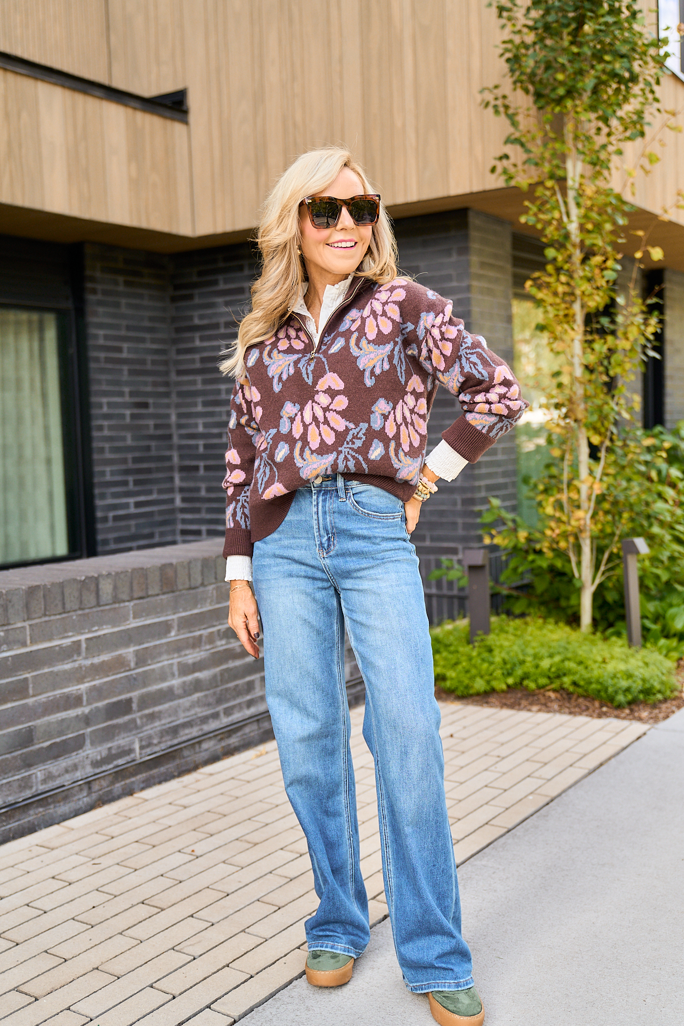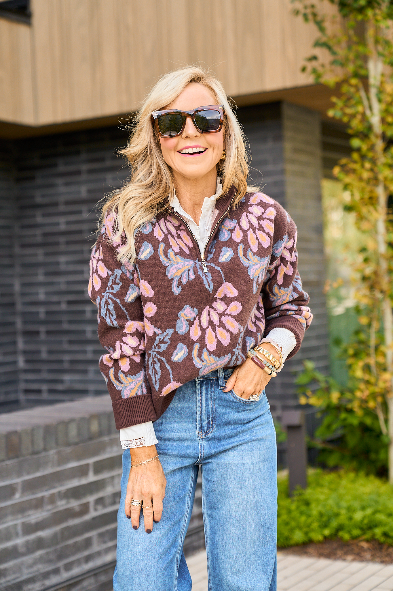 The Nancy Sweater | This sweater is an instant standout = and a total closet win AND a best seller at Avara for two years in a row! The Nancy Sweater in brown features an all-over intarsia knit floral pattern that brings just the right amount of personality with a stand collar and a half-zip closure, giving it a modern touch that makes slipping it on feel both effortless and a little elevated. With its long sleeves, ribbed trim, hip-length cut and relaxed fit, it strikes that sweet spot between cozy and put together. Made of a soft blend, it’s clearly built for comfort and wear-repeat ease. Pair it with your favorite jeans and layer over a crisp white shirt for a more styled fall outing. Its rich brown base and subtle floral detail works beautifully in neutral palettes and complements autumn’s deeper tones, making it a versatile piece you’ll reach for all season long.