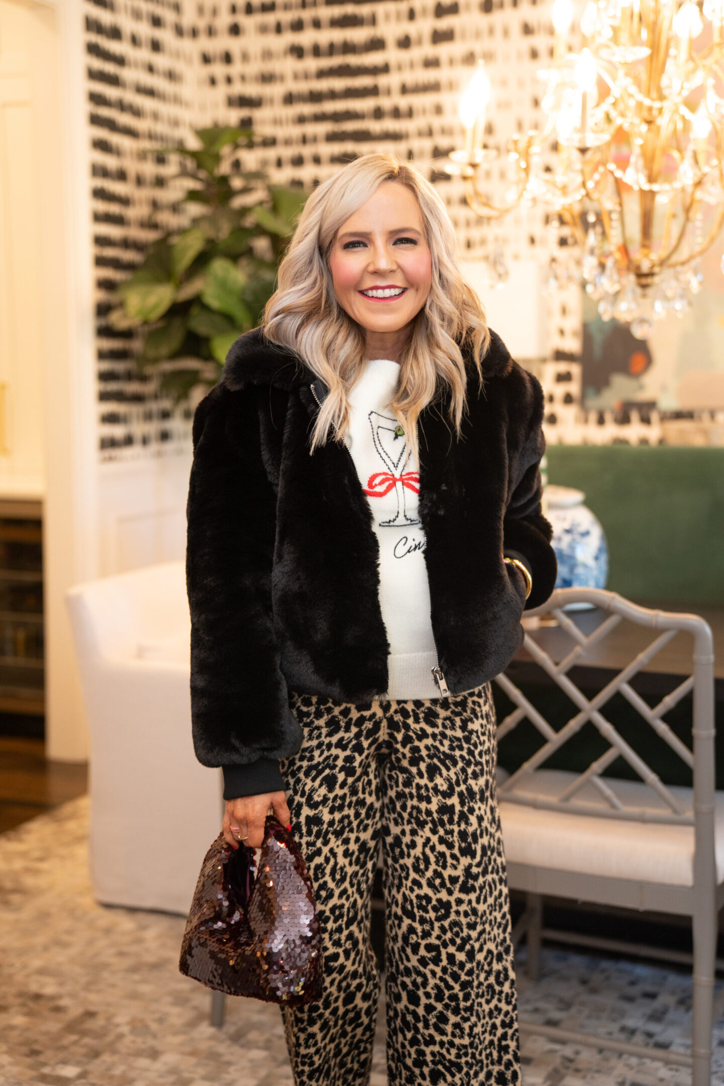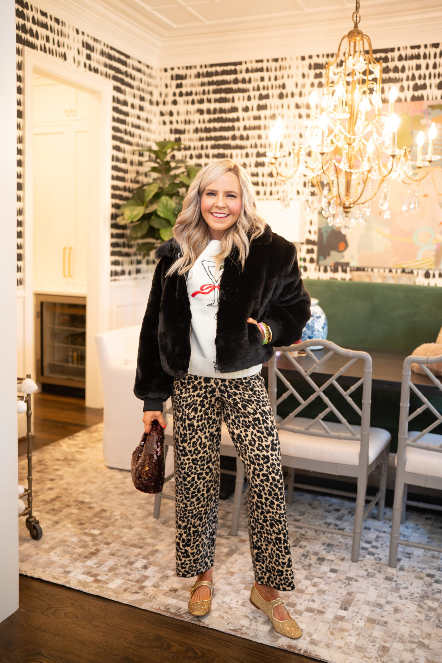 Holiday hosting but make it fun = this look is everything I love about December dressing. These leopard Colette Sweater Knit Pants [wearing XS, run TTS] bring the personality, and paired with the cheeky Cocktail Motif Sweater [wearing XS, runs TTS], it’s an instant conversation starter for cookie swaps, girls’ nights or any moment that calls for a little extra cheer. I also styled this with the Crop Faux Fur Coat [wearing XS, runs TTS], and WOW… it adds that glam and old-fashioned drama in the best way. Just pop on some sparkly flats, this statement Dolce Vita Sequin Bag, and you’re officially the most festive guest in the room.