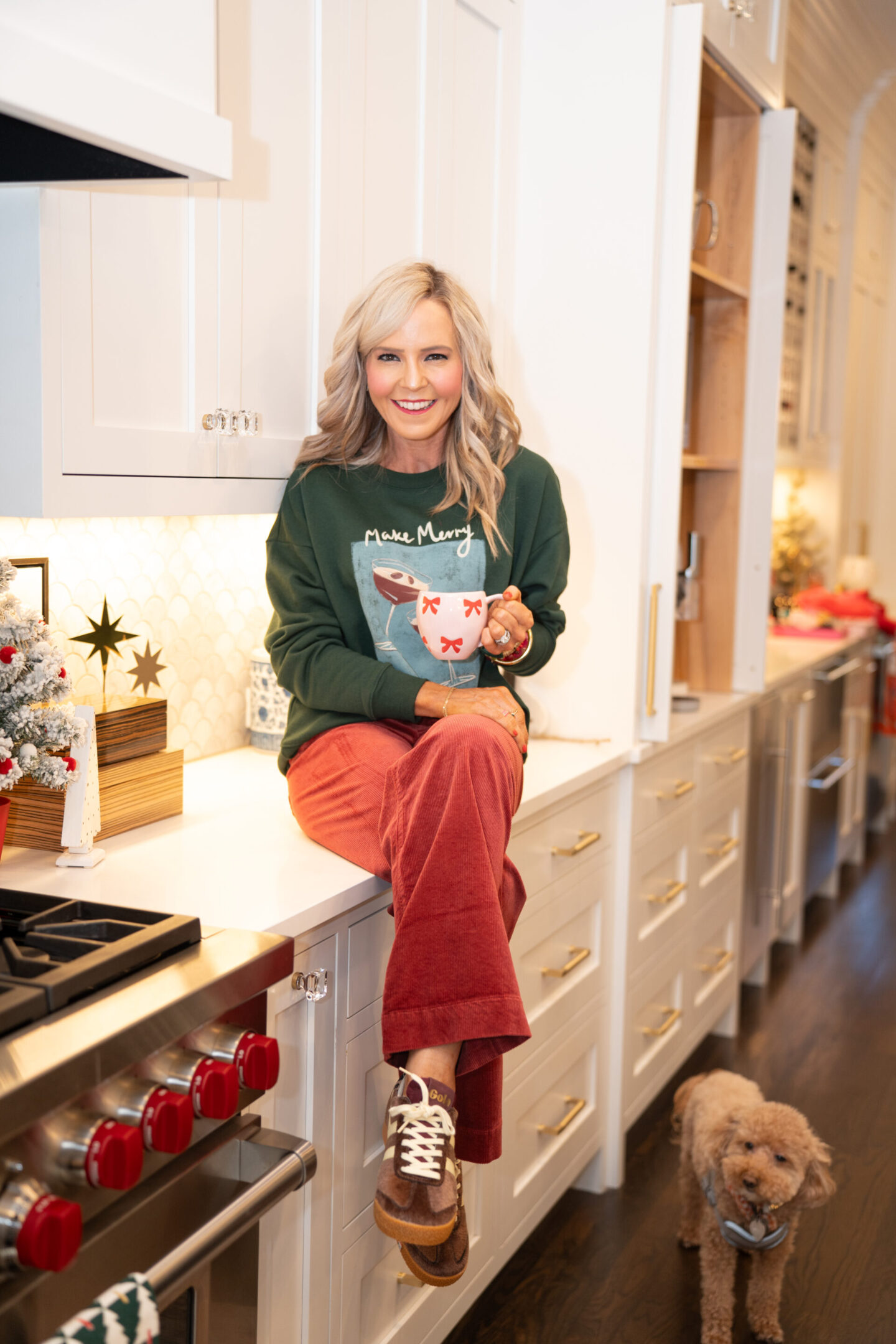 Ready for something a little more home for the holidays to sport around town when you’re running all those last minute errands?? This outfit is peak holiday cozy ✨ the Merry Graphic Sweatshirt [wearing size small, size up for roomy fit], the soft Colette Corduroy Crop Pants [run TTS, wearing size 24], and the Gola Retro-Vibe Sneakers [run big, size down 1/2 size] create that effortless “I’m festive but still comfy enough to wrap gifts, bake or lounge” vibe. And yes… if you spotted Tucker photobombing in the background, just know he fully approved this outfit. He clearly has great taste!! This look is the perfect December uniform: cheerful, warm and easy to wear from morning coffee to nighttime cocoa.
