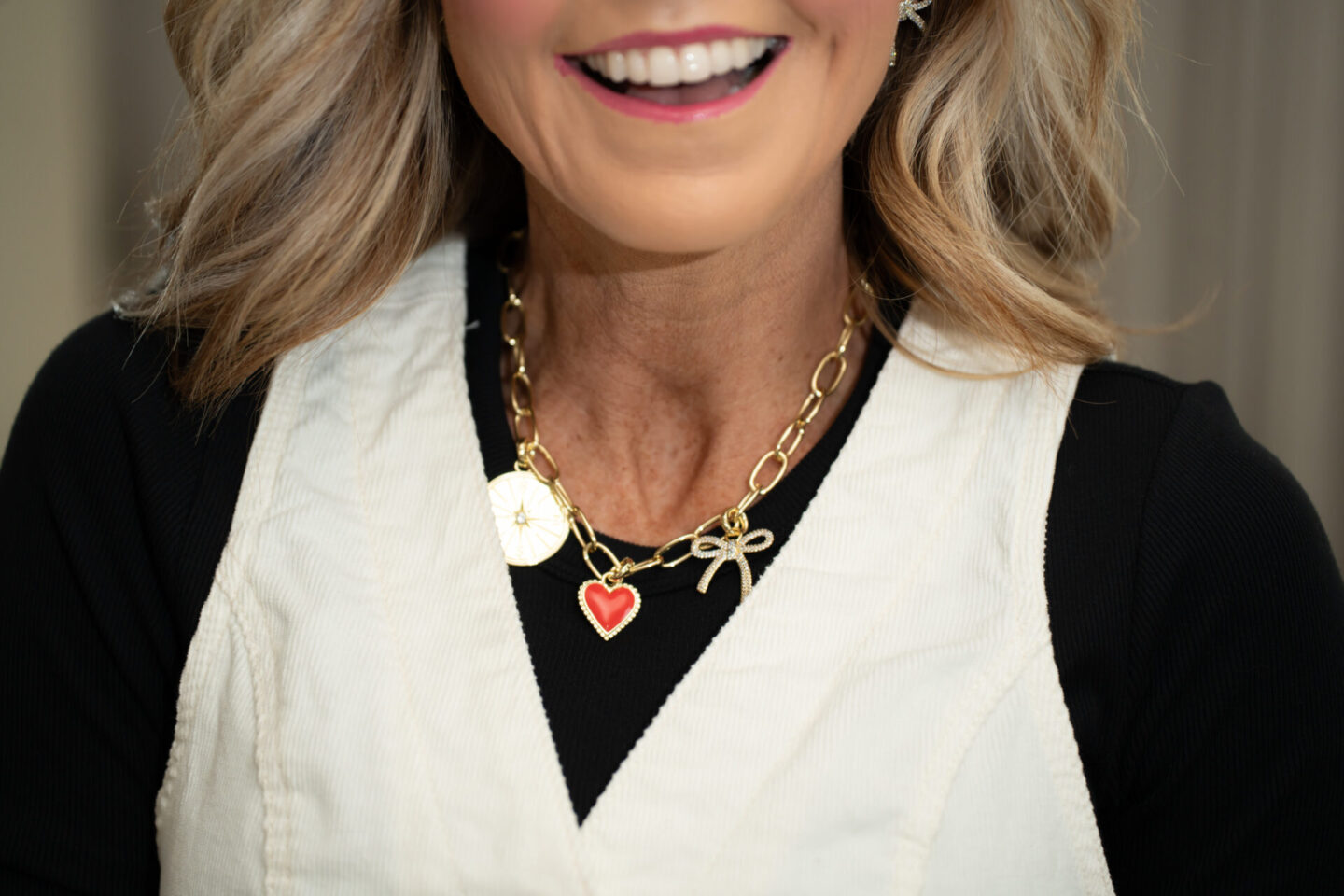 Lots of you have been collecting the custom charms we created to go alongside the statement Sawyer Necklace and I couldn’t wait to debut not one, but THREE new charms to the collection… we have the beautiful bow charm which coordinates perfectly with the matching earrings for that chic + stylish bow lover, the compass charm so that you’ll always find your way and then the red enamel heart [my personal favorite] = a classic style with a bold pop of color that makes me think of my favorite holiday movie, Love Actually [because LOVE is all around]. I love that Allie + Bess has created a trio set of charms you can purchase together if you already have the necklace OR you can buy the full look here. P.S. I wear the 15″ length necklace AND they’ve made it easy to create your own custom charm set… add any three charms to get your favorites all on one strand!