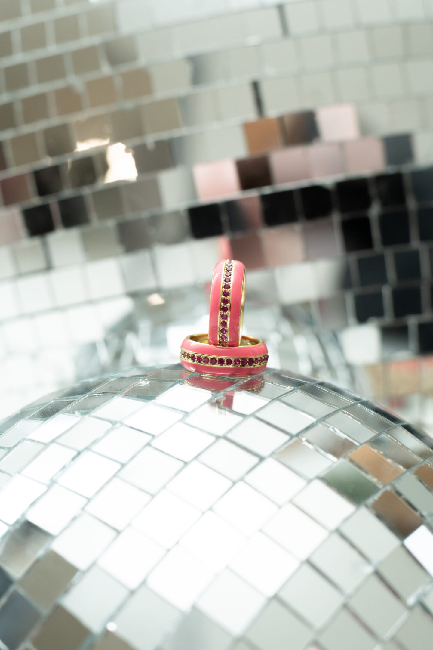 Finally, lastbut CERTAINLY not least… let’s talk cotton candy = that perfect pop of holiday pink please!! The Maris Ring combines glossy enamel with a row of sparkling red rhinestones for that instant wow factor = a total winner for the winter! It’s a statement on its own but pairs perfectly with your everyday bands for a playful, stacked look.