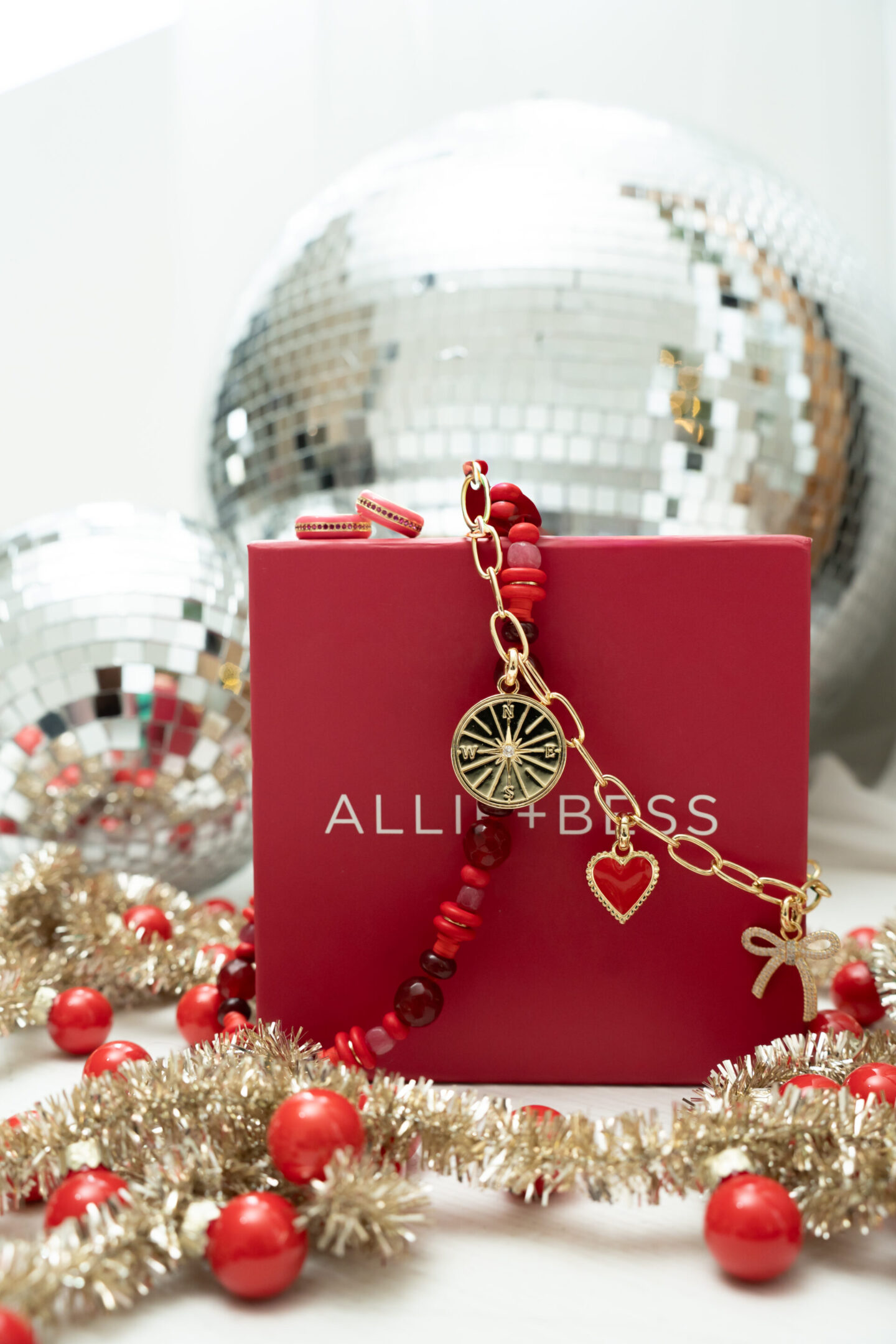 This season, I wanted jewelry that works for family date nights, holiday brunches, special occasion outings and even gifting = and still has that “yes! I feel festive” shimmer without going full-on novelty. With my all new debut with Allie + Bess, we’re leaning into everything I love about statement jewelry… lots of beading, fun color combinations, more meaningful charms, and pops of rich jewel tones that exude winter fashion + fun. Every piece is made to layer, mix, match [because you know me—I’m the queen of stacking], and feel like you, only a bit more twinkly.