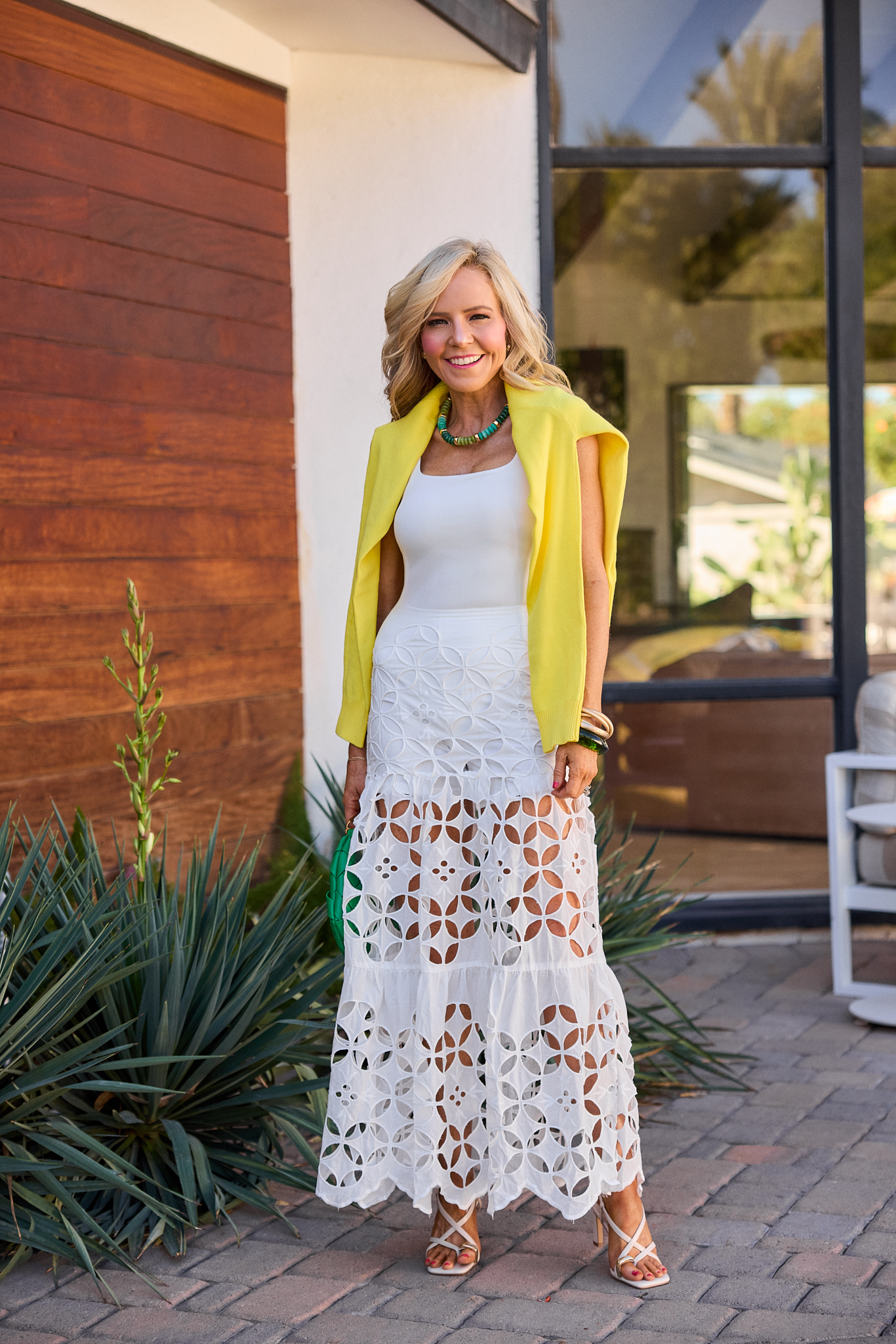 And then last, but CERTAINLY not least… the showstopping maxi skirt everyone has been asking me about! I am THRILLED with the finished product on this gorgeous eyelet skirt we created just for this debut! It’s equal parts contemporary with a classic a-line silhouette and features built-in shorts to make it more practical. It’s soft, feminine, and easy to style with fitted tops or flowy blouses and is waiting to be worn on your next escape from the everyday. [wearing XS, runs small]