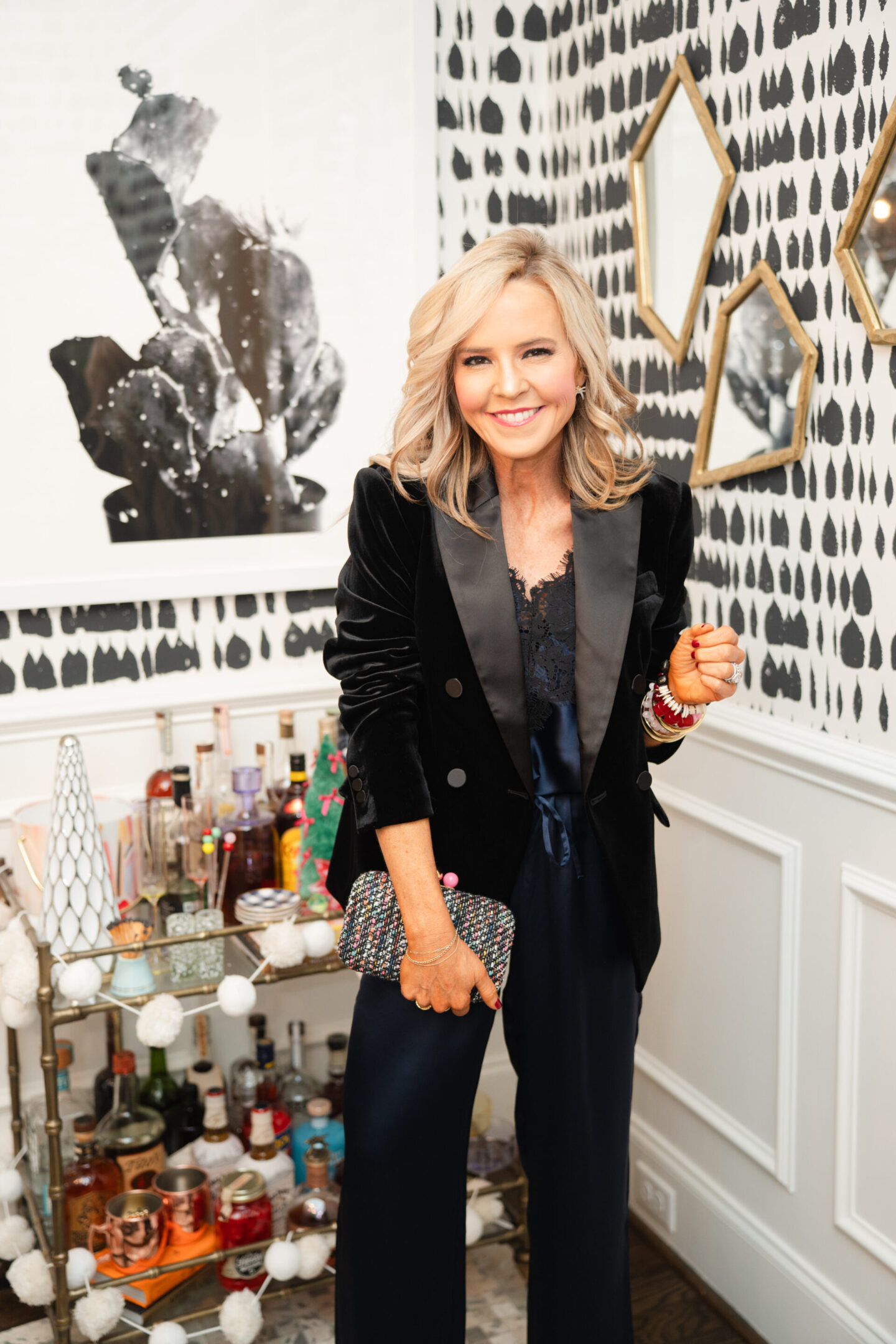 Kicking things off with a little velvet + satin magic — because if there was ever a season to lean into luxe layers, it’s right now! This Navy Satin Cami [runs TTS/wearing XXSP] + matching Wide Leg Pull On Pant [wearing XXSP/runs TTS] pairing is sleek, dress, and secretly OH SO COMFY… the dream combo for hosting a merry little cocktail hour or heading out for Christmas Eve dinner. And can I just say how much I ADORE the navy and black color combo… a bit unexpected but super luxe in look yet the price is right because it’s all on sale!! And when you need a little extra layer… go ahead and toss on the Sleek Velvet Tuxedo Blazer [wearing XXSP/runs TTS] and boom… instant “she’s the festive friend who always gets it right.” It’s classic, polished, and positively sleigh-ing in the best way.