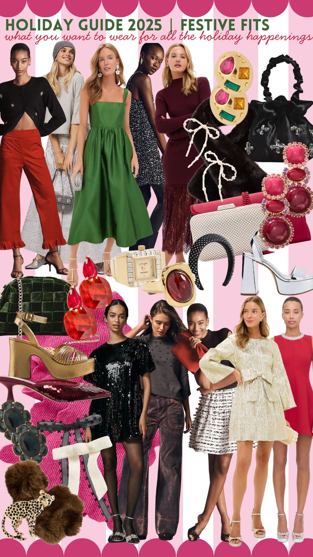And because no holiday season is complete without a little mix-and-match magic, I pulled together a merry roundup of festive fits + fashionable favorites to carry you through every party from now until the new year [and beyond if necessary!!]. Think a swoon-worthy green satin midi dress for those dress-to-impress moments, a black sequin mini shift that’s basically a walking disco ball, and the dreamiest shoe duo: silver block heels for dancing all night and the perfect red sequin kitten heel. I added a chic black faux-fur scarf [SO old-Hollywood and uber classy], the cutest leopard brooch, and plenty of bow-statement earrings + hair accessories because this is absolutely the season of the bow. Round it out with a green velvet clutch, the softest Anthropologie grey sweater, and black velvet pants that go from “girls’ night in” to “Christmas cocktails” in two seconds flat. Basically… your holiday wardrobe just hit the sleigh button 😉