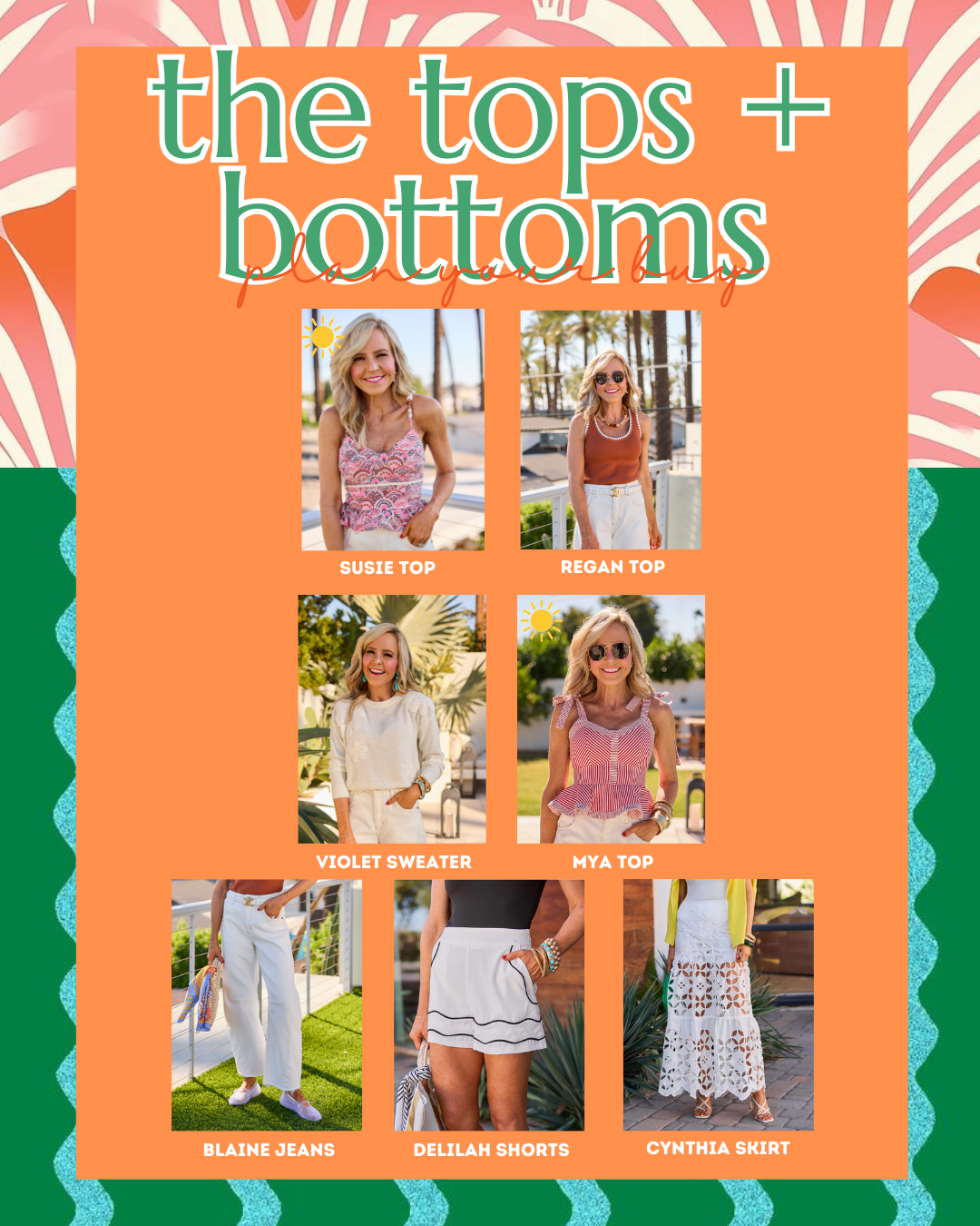As for everything tops + bottoms, we wanted easy + effortless styles to throw on after a relaxing vacation day spent lounging and living that leisure life. All made for mixing and matching = daytime chic seaside style but dressy enough to wear for a sunset dinner date night, too! In terms of top notch picks from this assortment, I’ve got to give some special love to the Susie and Maya Tops as well as the Delilah Shorts and Cynthia Skirt. P.S. did you see the neutral bottoms?? Who am I and what did they do with my former self??
