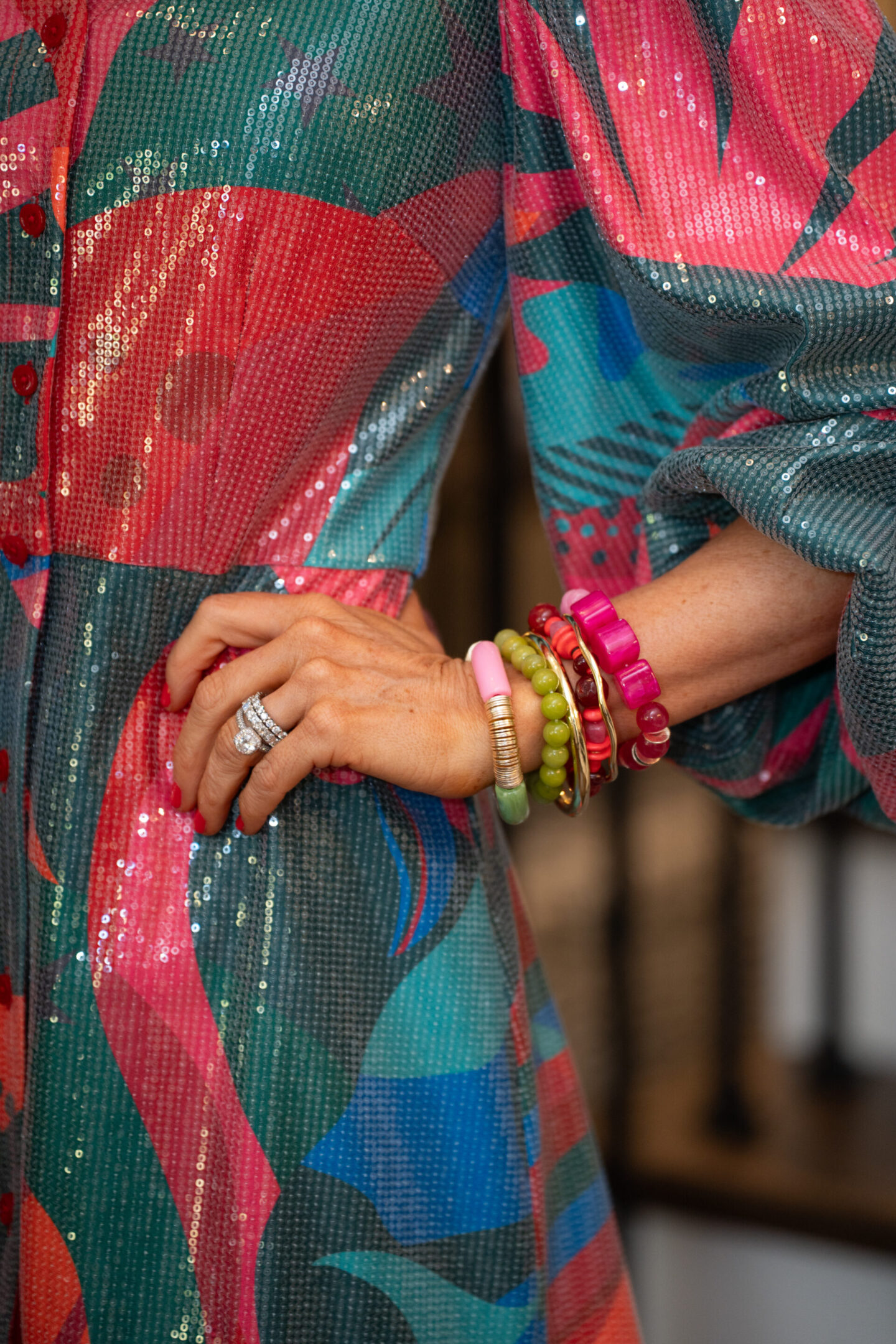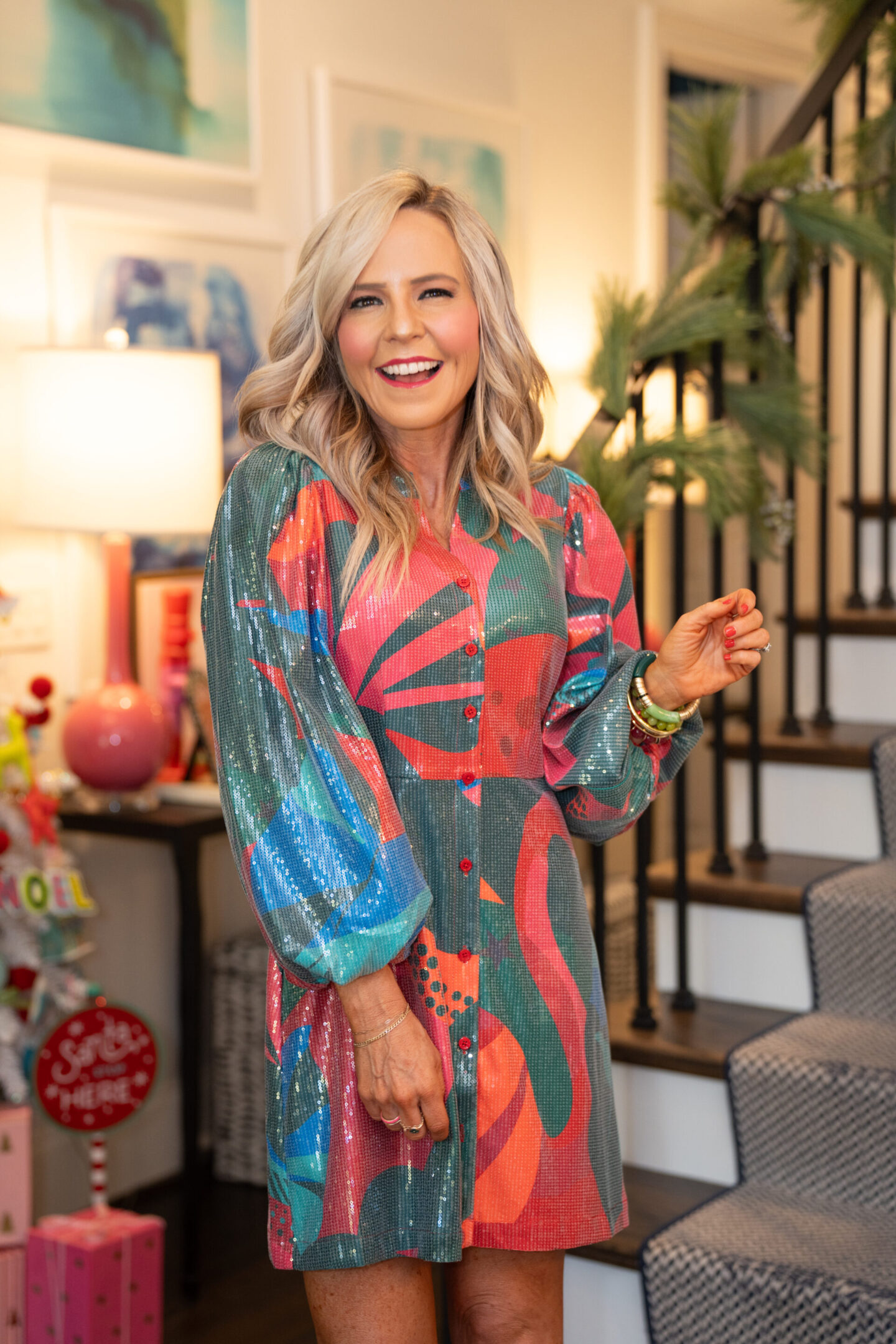First things first, I shared this Athena Dress [wearing XS, runs TTS] off a few weeks ago on Instagram and everyone was taking note of this new and noteworthy designer I was talking about… including in their latest drop, the Holiday Collection, it is the definition of festive fun = bold, bright and absolutely ready for every holiday moment on your calendar. The sequin finish catches the light in the prettiest way, and the abstract print feels playful without trying too hard = and totally appropriate to wear now AND after the holidays as well. I love that it’s one of those “throw it on and instantly feel fabulous” pieces… no fussing, no overthinking, just sparkle, color and confidence. Pair it with a statement heel and let the dress do ALL the talking. Thinking of adding more shimmer into your wardrobe?? Be sure to check out the Jillian Dress or Emory Dress, too!