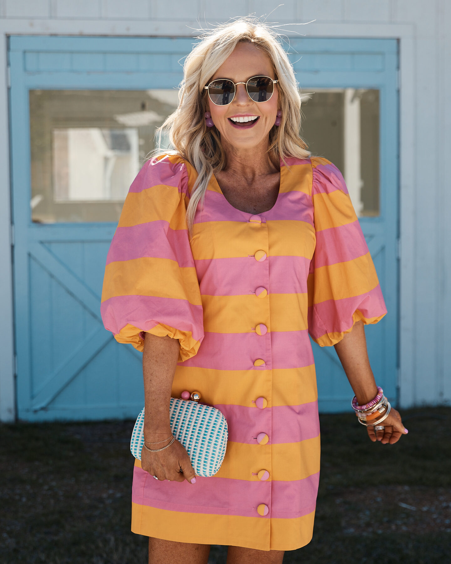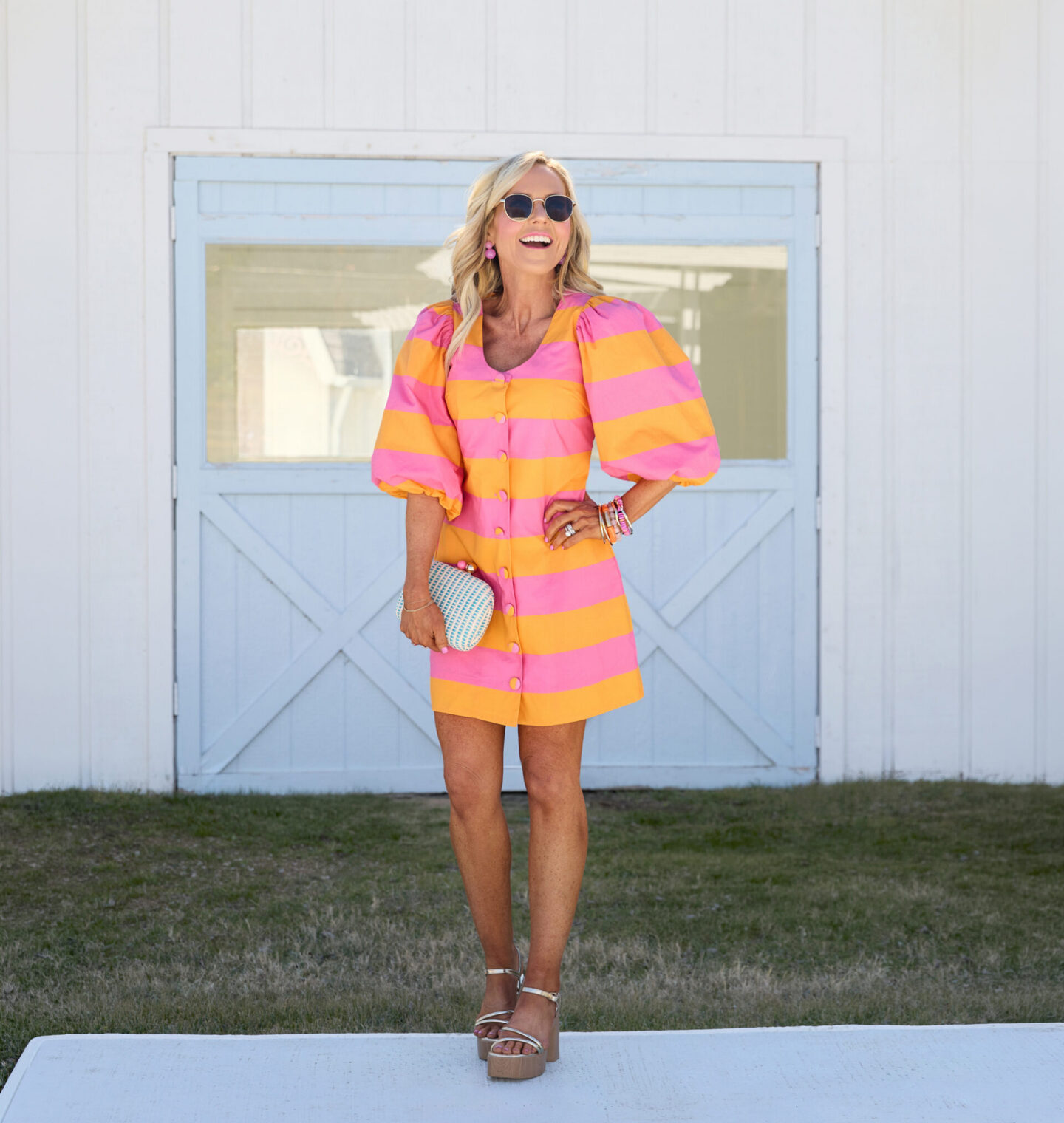 Exclusive Avara Design | Sunshine is calling… spring break brights are ready to catch flights AND rays, and this holiday-inspired, sun-drenched duo of happiness is ready to be styled all season long! We took my best-selling dress from last summer and decided to recreate the magic—because pink and orange make a stellar, sensational color combo. I just ADORE the fabric-covered button-front accents, the balloon sleeves for a bit of drama, and the flattering sheath fit. Vacation is almost here, and this beauty is absolutely getting carried away with me to the Caribbean! [wearing XS/runs TTS]