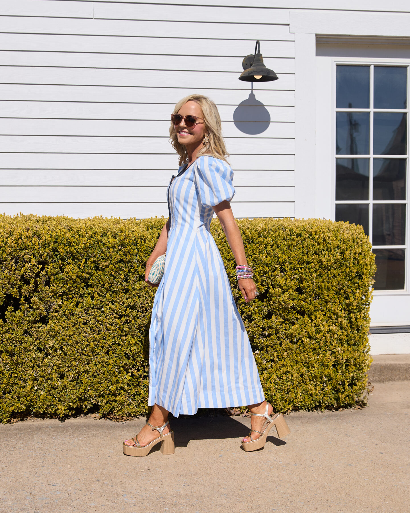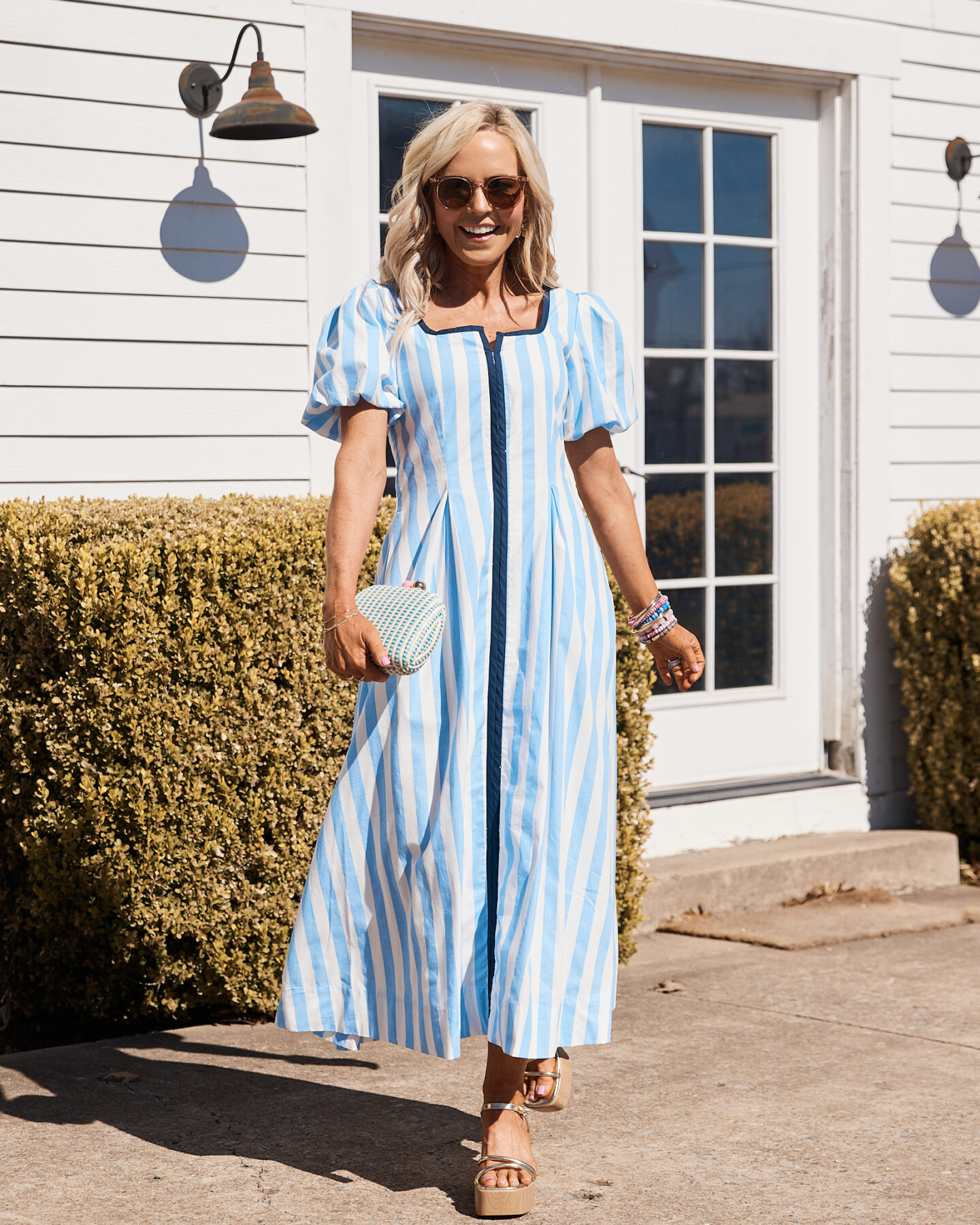 Shades of crisp + cool coastal blue = it’s time to head south with this vertical striped showstopper. We started with a simple color palette that screams spring and then incorporated navy blue accents throughout the bodice for a bit more contemporary look. Stripes… it’s what I am known for! The puff sleeves + effortless cut + spring hues make this one you’ll reach for over and over again this season AND into summer. [wearing XS/runs TTS]