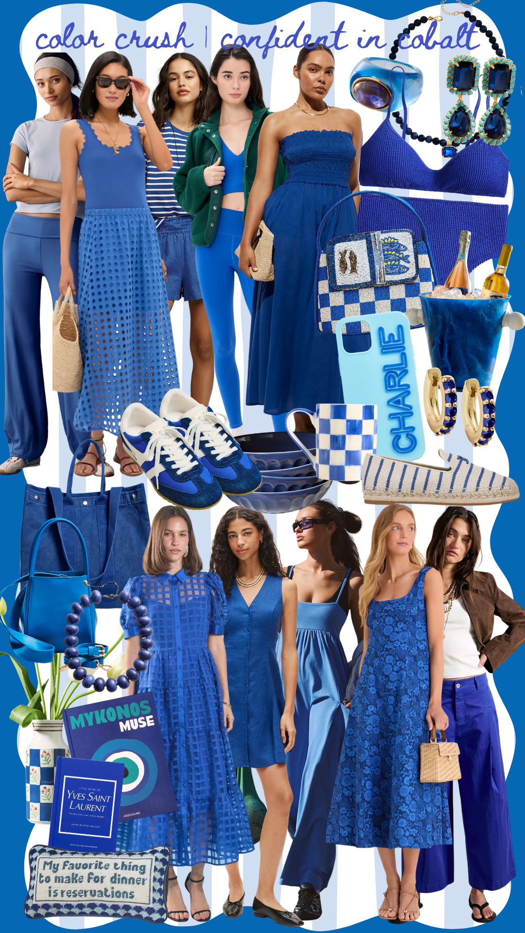 But for this go around, we are currently crushing hard on cobalt blue—bold, bright and beautifully confident. This color commands attention in the best way, as a strong + saturated hue that stands out. It’s cleaner than navy and more refined than royal and brings a look of sophistication, too! From chic sets to statement accessories, cobalt is having a major moment and I’m completely here for it. It’s vibrant yet versatile, making even the simplest outfit feel styled and striking… and with summer on the way, it brings a vibrant energy to however you decide to wear it!