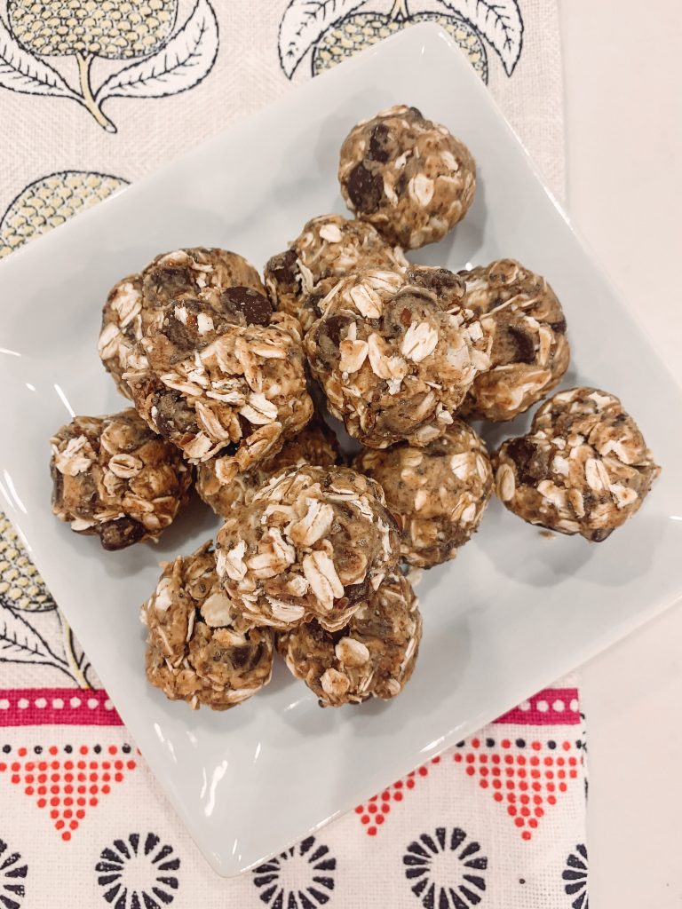 Directions: Line baking sheet with parchment paper. Assemble all ingredients in a glass bowl and mix together—then roll into balls and place onto baking sheet. Finally put in freezer for 2+ hours and then store in air tight container!! **you could totally substitute almond butter, add in shredded coconut and/or dried cranberries, etc…