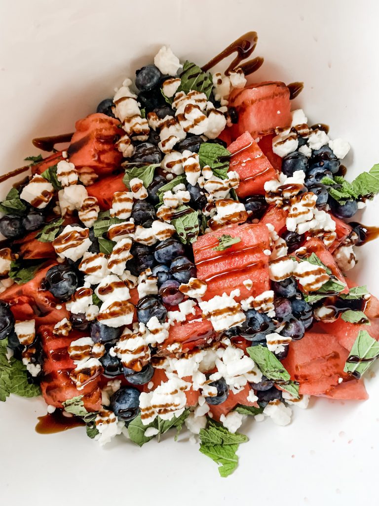 Ingredients: 1/2 of a Small Watermelon Cut into Square Pieces, 1 Pint of Blueberries, Small Container of Crumbled Feta Cheese, Small Batch of Fresh Mint Leaves, Balsamic Glaze [Found Near Oil/Vinegar in Grocery Aisle] Directions: combine watermelon, blueberries, feta and mint leaves and stir together; top with generous drizzle of balsamic glaze and serve immediately **would also work well with other types of fruit: blackberries, strawberries, peaches