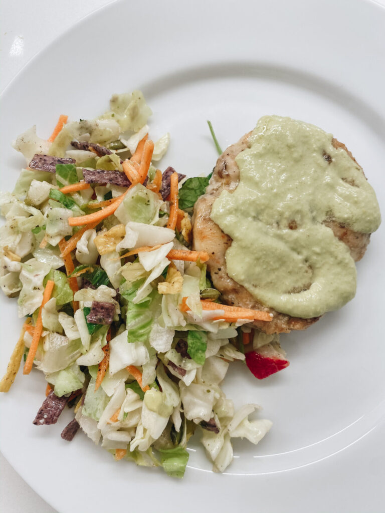Three staples from Trader Joe’s that make for a quick, healthy and high in fat/low in carb dinner… pan fried the shrimp burgers in avocado oil for healthy fats, topped with the jalapeno cream sauce and then incorporated the TJ salad = easy + tasty for the low carb day win!
